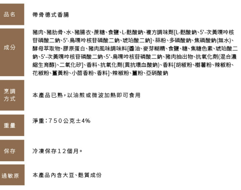 備註 過敏原提示:本產品含有大豆,麩質及其類製品,不適合過敏體質者食用