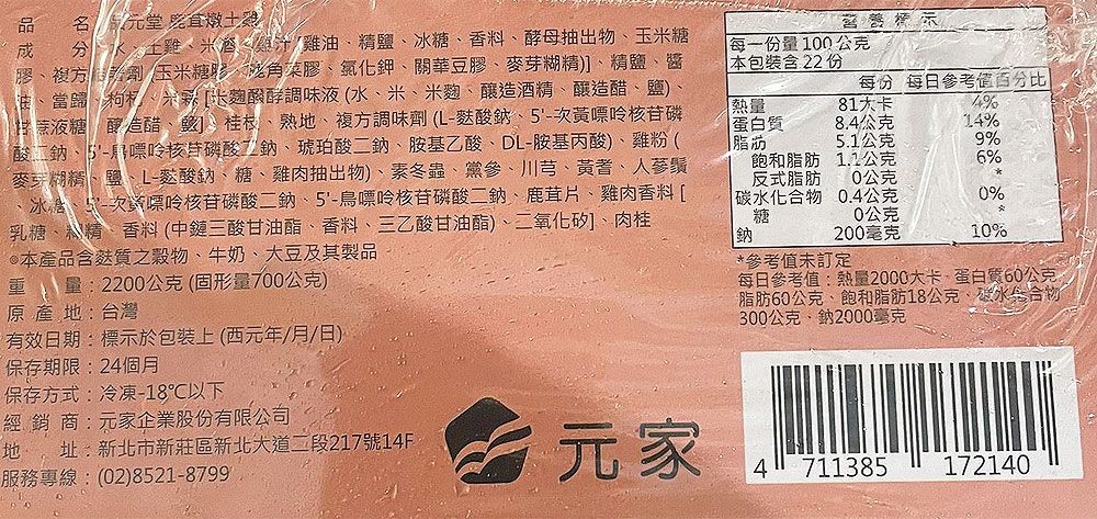 成分:水、土雞、米酒、雞汁[雞油、精鹽、冰糖、香料、酵母抽出物、玉米糖膠、複方結著劑(玉米糖膠、鹿角菜膠、氯化鉀、關華豆膠、麥芽糊精)、精鹽、醬油、當歸、枸杞、米霖[米酸酵調味液(水·米、米麹、釀造酒精、釀造醋、鹽)、甘蔗液糖、釀造醋、鹽]、桂枝、熟地、複方調味劑(L-麩酸鈉、5′-次黃嘌呤核昔磷酸二鈉、5′-鳥嘌呤核苷磷酸二鈉、琥珀酸二鈉、胺基乙酸、DL-胺基丙酸)、雞粉(麥芽糊精、、-酸鈉、、雞肉抽出物)、素冬蟲、黨參、川芎、黃耆、人鬚、冰糖、5-次黃嘌呤核磷酸二鈉、5-鳥嘌呤核昔磷酸二鈉、鹿茸片、雞肉香料[乳糖、糊精、香(中鏈三酸甘油酯、香料、三乙酸甘油酯)、二氧化矽]、肉桂