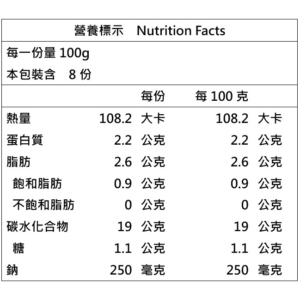 成分:水、在來米、芋頭、玉米粉、沙拉油、干貝、蔥酥(红蔥頭、棕櫚油、玉米澱粉)、蝦米、鹽、 L-麩酸鈉(調味劑)、芝麻香油(大豆油、芝麻油)、白糖、胡椒粉(白胡椒粉、地瓜纖維、綠辣椒粉)
