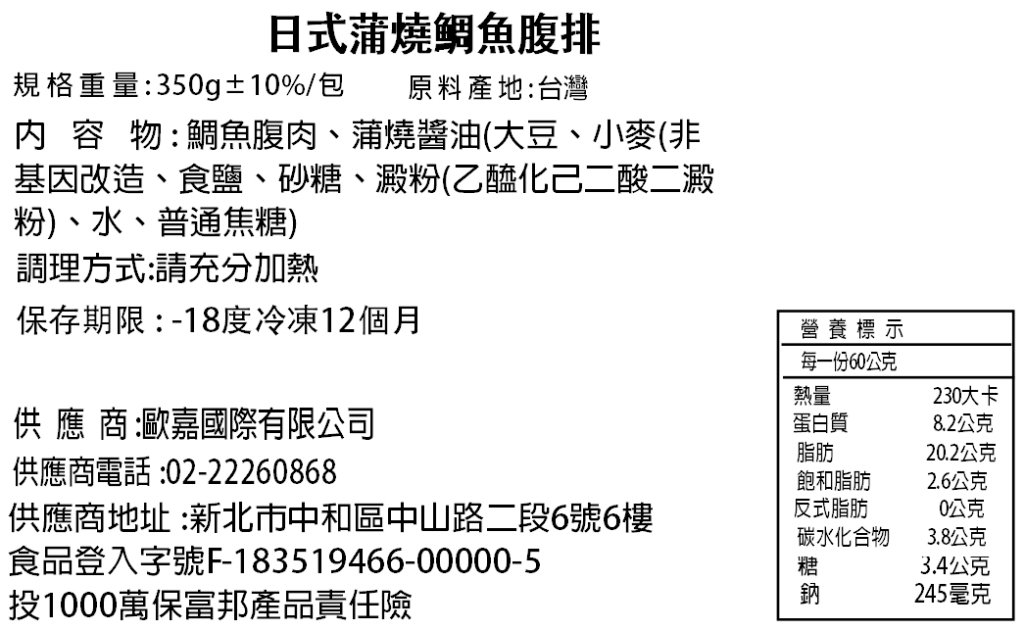規格:350g±10%(5片) 產地:台灣 內容物:依圖片標示 一般袋裝 配送方式冷凍配送 商品產地台灣 食品添加物依圖片標示 保存期限-18度冷凍保存24個月(未拆封),開封後請盡早食用完畢 解凍方式無須完全解凍即可烹調,微波加熱,烤箱 備註過敏原提示:本產品含有魚類及其類製品,不適合過敏體質者食用
